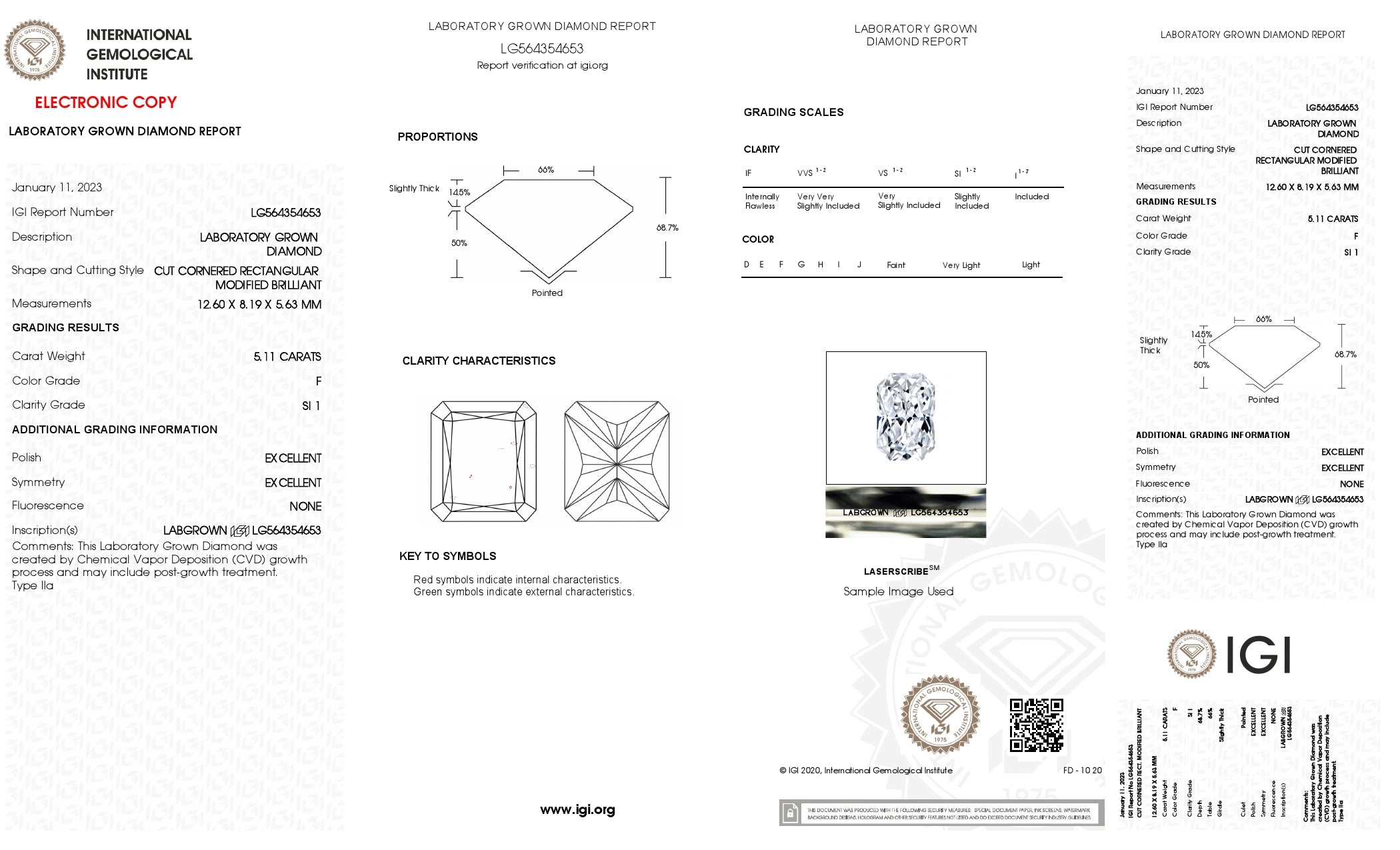 5.11 Ct. Radiant Wholesale IGI Certified Lab Grown Loose Diamond. (Clarity SI1 / F Color)