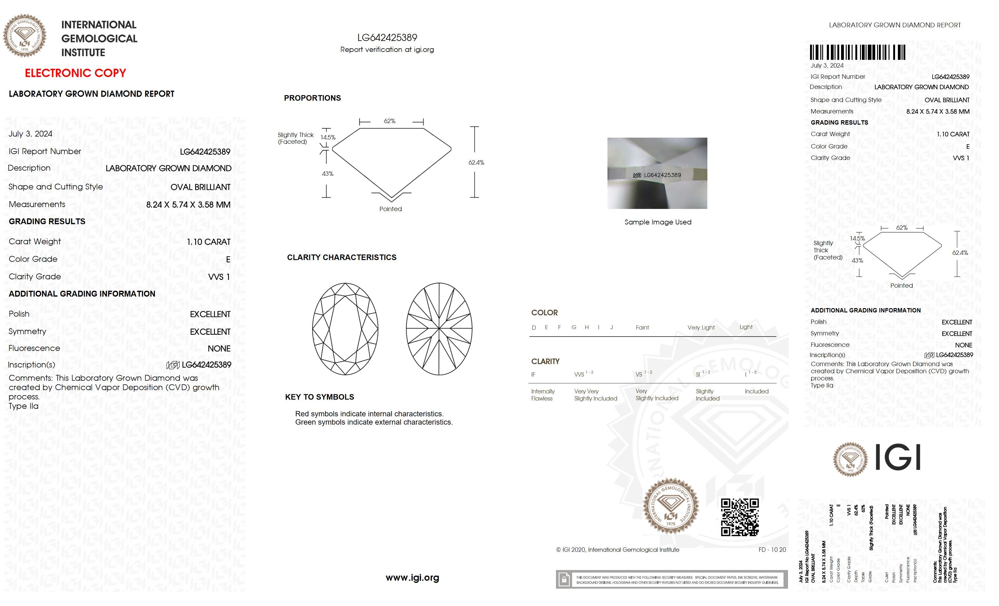 1.1 Ct. Oval Wholesale IGI Certified Lab Grown Loose Diamond. (Clarity VVS1 / E Color)
