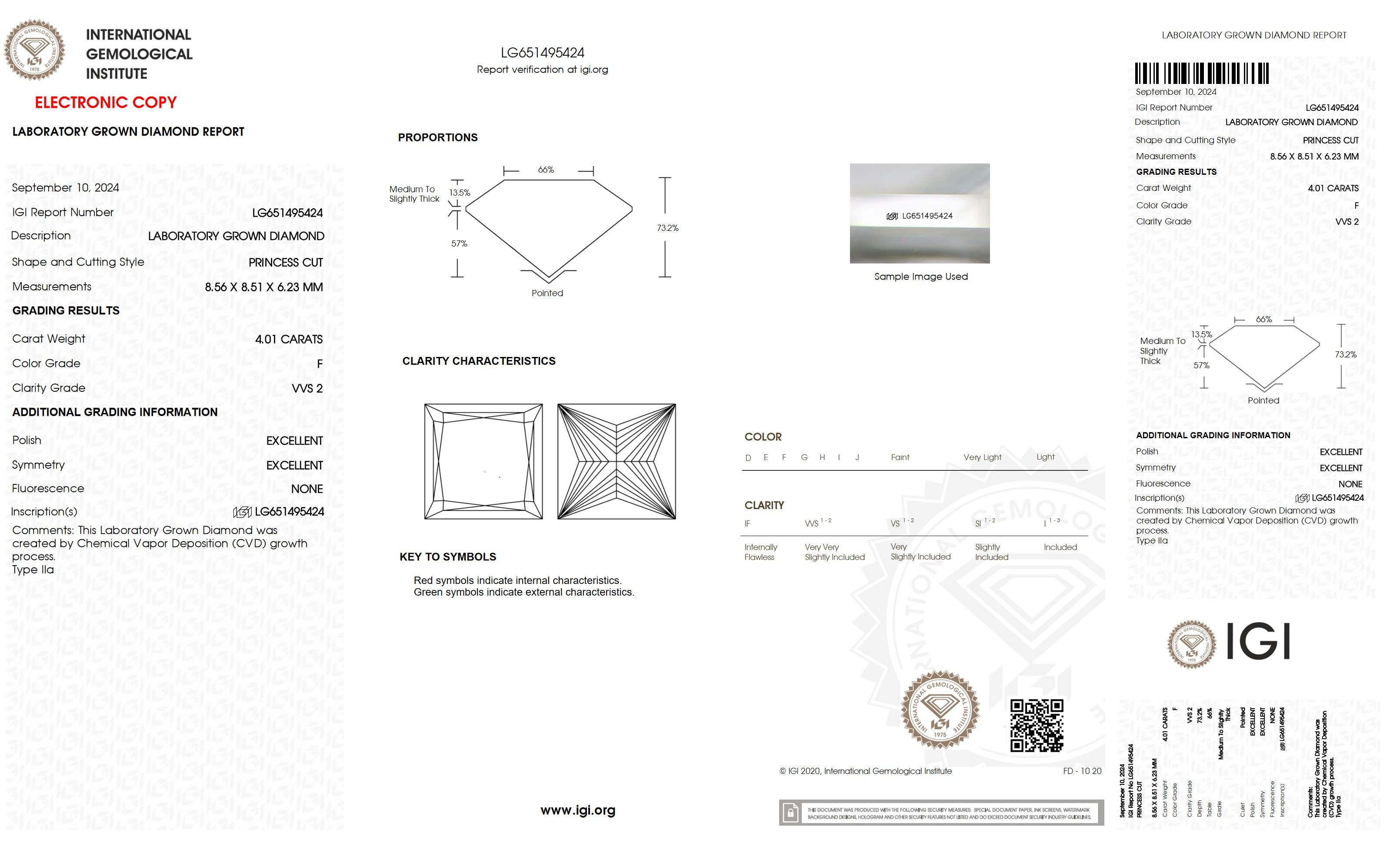 4.01 Ct. Princess Wholesale IGI Certified Lab Grown Loose Diamond. (Clarity VVS2 / F Color)