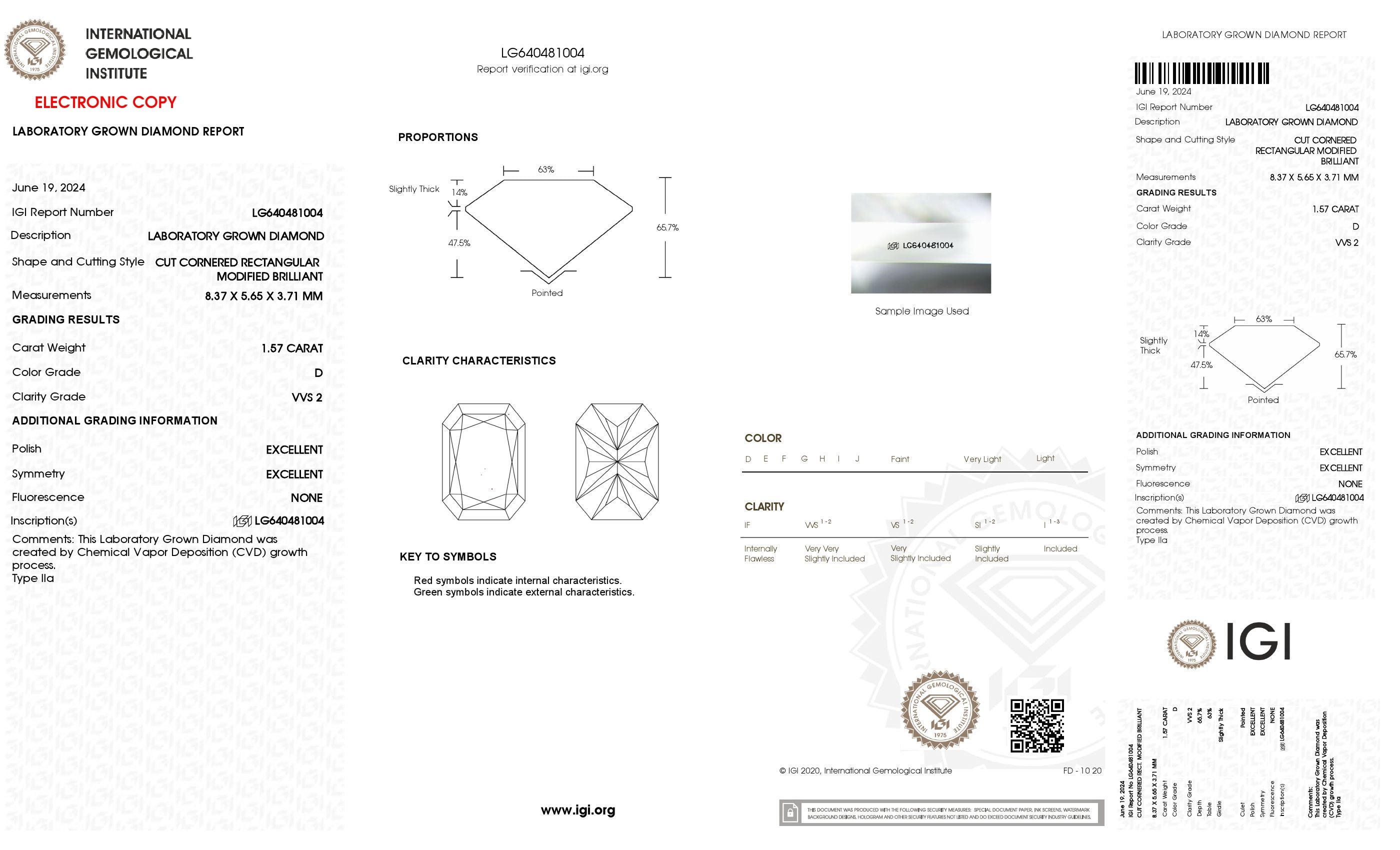 1.57 Ct. Radiant Wholesale IGI Certified Lab Grown Loose Diamond. (Clarity VVS2 / D Color)