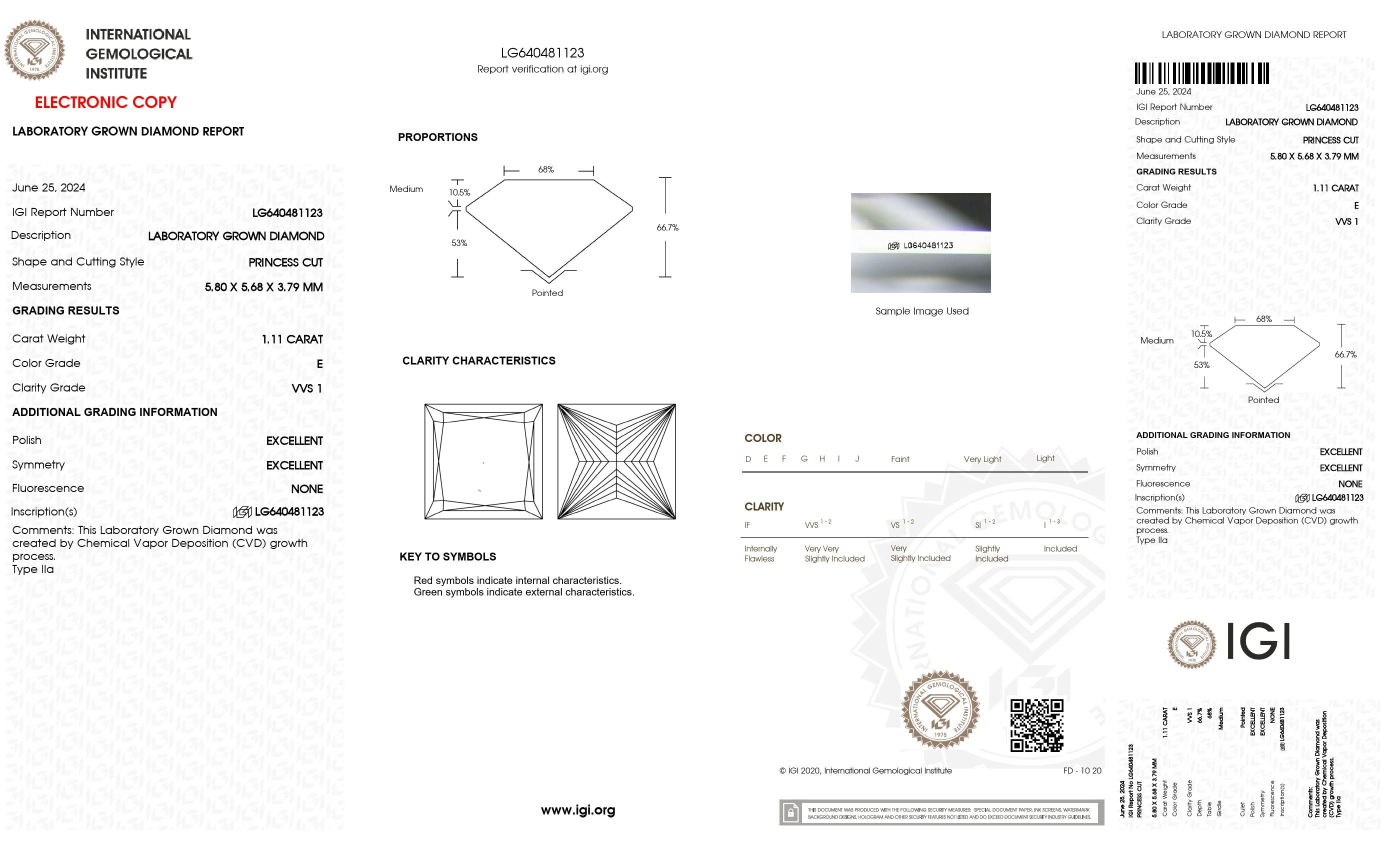 1.11 Ct. Princess Wholesale IGI Certified Lab Grown Loose Diamond. (Clarity VVS1 / E Color)