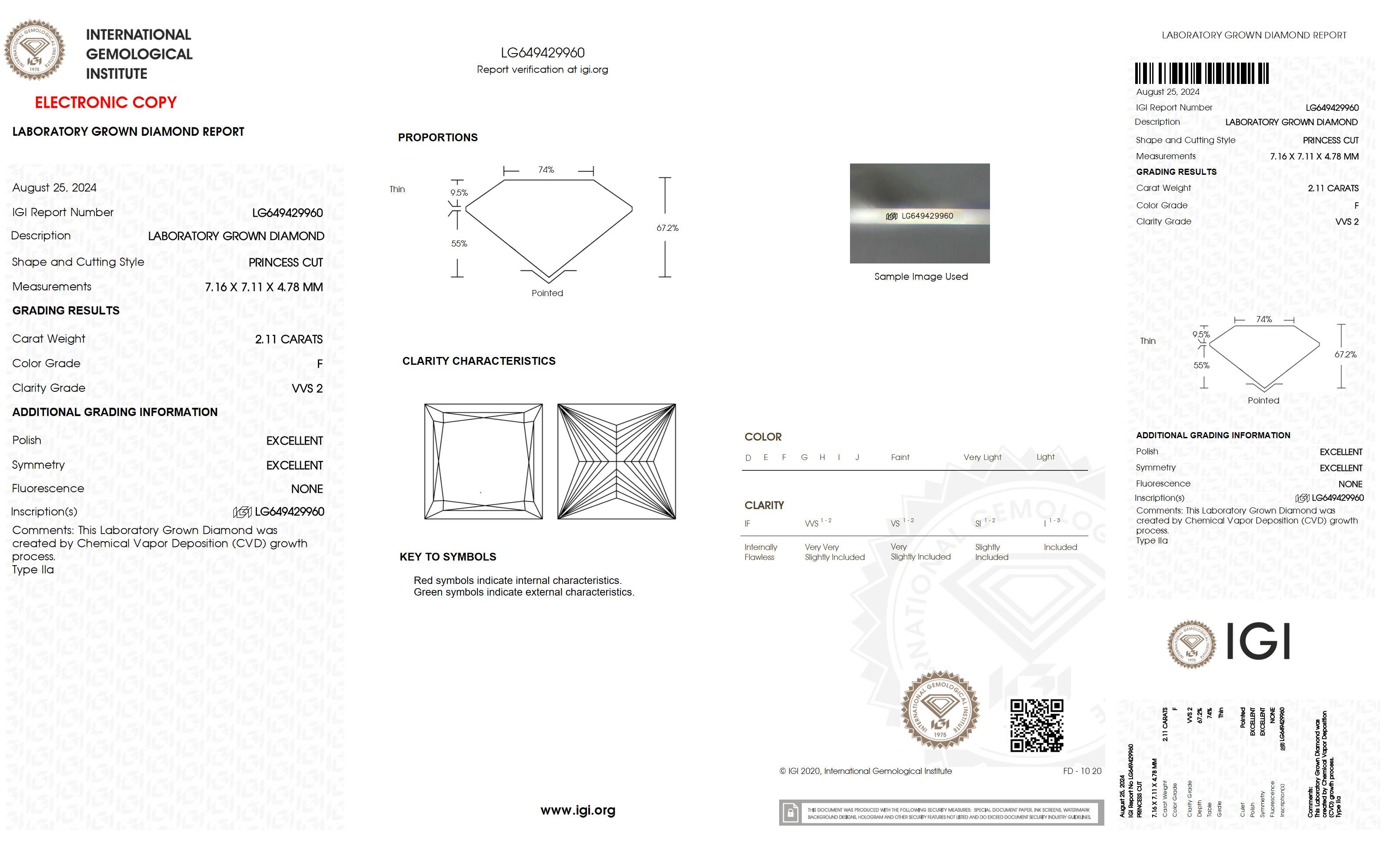 2.11 Ct. Princess Wholesale IGI Certified Lab Grown Loose Diamond. (Clarity VVS2 / F Color) Experience the luxury and style of our exquisite lab-grown diamond collection. Adorned with a magnificent 1.00 to 15.00 carat lab-grown center stone, each piece is certified by IGI for your peace of mind. Our lab-grown diamonds are renowned for their superior sparkle, making them an ideal choice for any engagement ring. We also handpick our diamonds and choose the finest laboratory grown diamonds for our customers, ensuring exceptional quality. Our lab grown diamonds are carefully selected for their superior cut and clarity. Every lab-grown diamond we provide is accompanied by an IGI certificate for premium quality and authenticity.