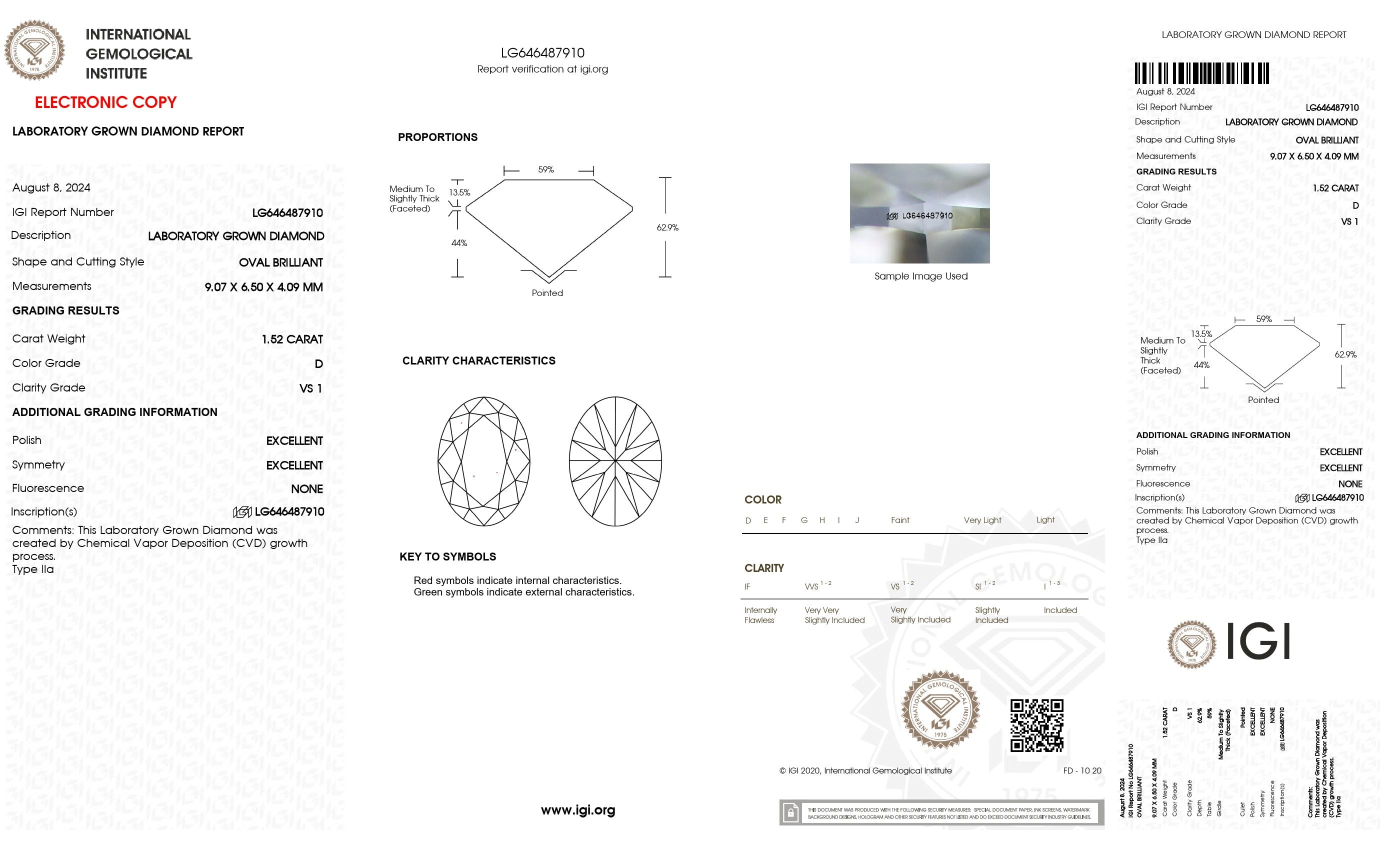 1.52 Ct. Oval Wholesale IGI Certified Lab Grown Loose Diamond. (Clarity VS1 / D Color) Experience the luxury and style of our exquisite lab-grown diamond collection. Adorned with a magnificent 1.00 to 15.00 carat lab-grown center stone, each piece is certified by IGI for your peace of mind. Our lab-grown diamonds are renowned for their superior sparkle, making them an ideal choice for any engagement ring. We also handpick our diamonds and choose the finest laboratory grown diamonds for our customers, ensuring exceptional quality. Our lab grown diamonds are carefully selected for their superior cut and clarity. Every lab-grown diamond we provide is accompanied by an IGI certificate for premium quality and authenticity.