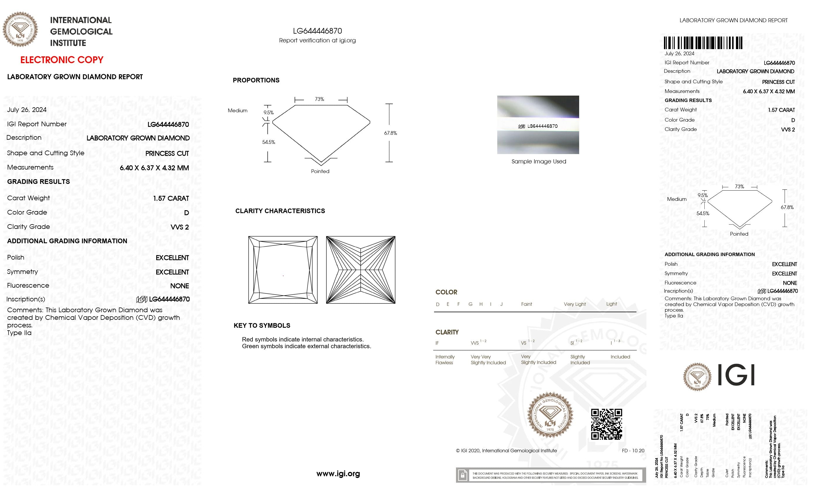 1.57 Ct. Princess Wholesale IGI Certified Lab Grown Loose Diamond. (Clarity VVS2 / D Color)