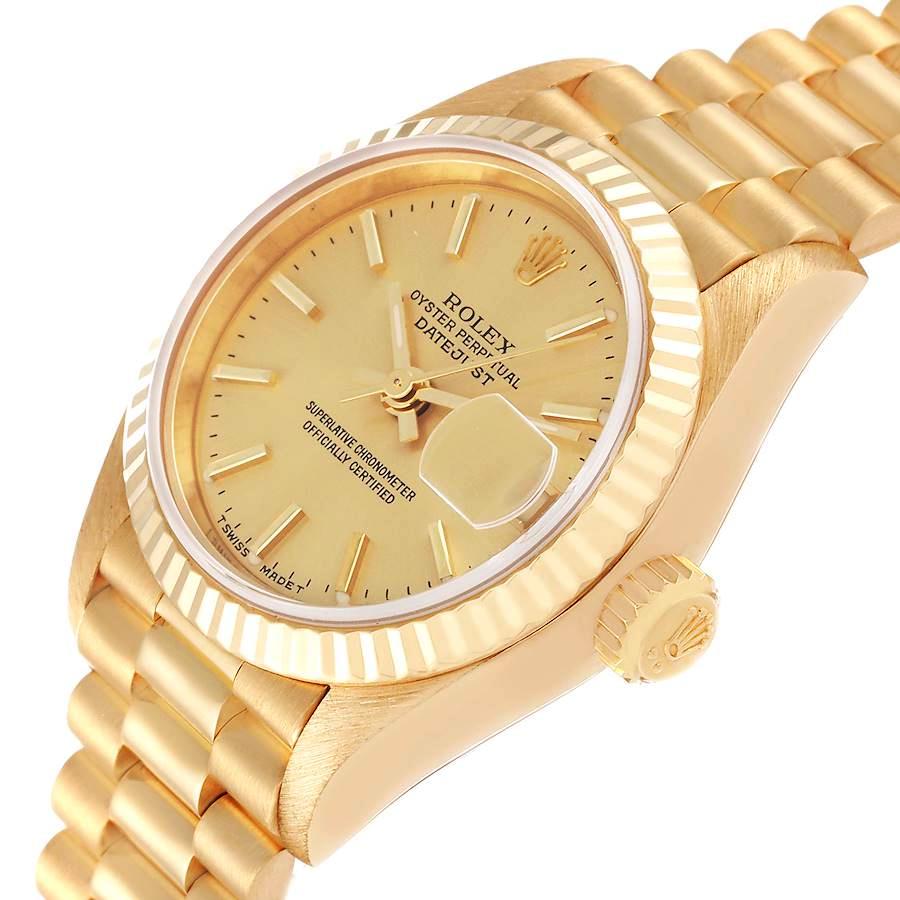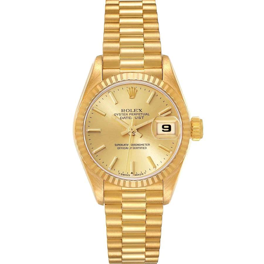 Ladies Rolex 26mm Presidential 18K Yellow Gold Watch with Gold Dial and Fluted Bezel. Pre-Owned SN# R43**** Brand: Rolex. Model: DateJust. Dial Color: Gold. Series: President. Crystal: Sapphire. Gender: Women's. Bezel: Fluted Bezel. Dial: Diamond Dial. Condition: Excellent. Model Number: 6917. Case Dimensions: 26mm. Metal Type: 18K Solid Yellow Gold. Movement: Self-Winding (Automatic). Bracelet / Strap: Presidential 18K Solid Yellow Gold. Box / Certification: Rolex Box / Certificate of Authenticity. Warranty: One (1) Year Limited Service Warranty.