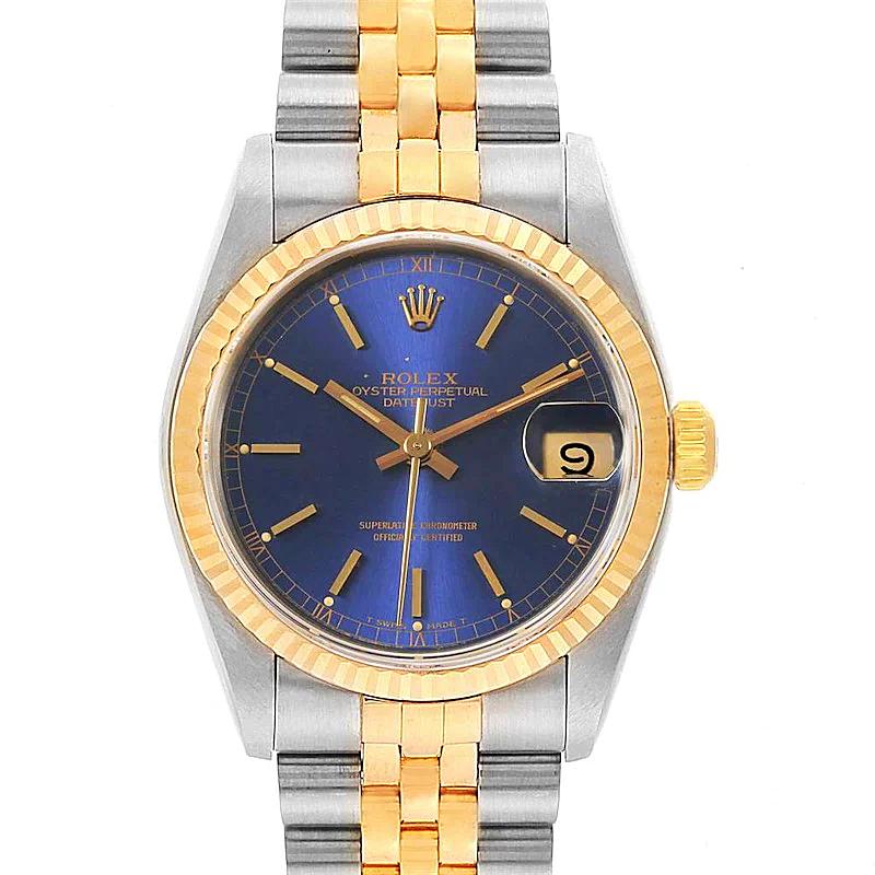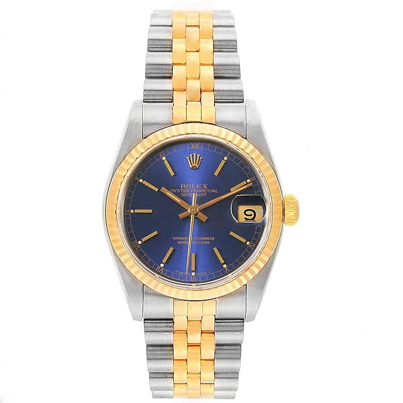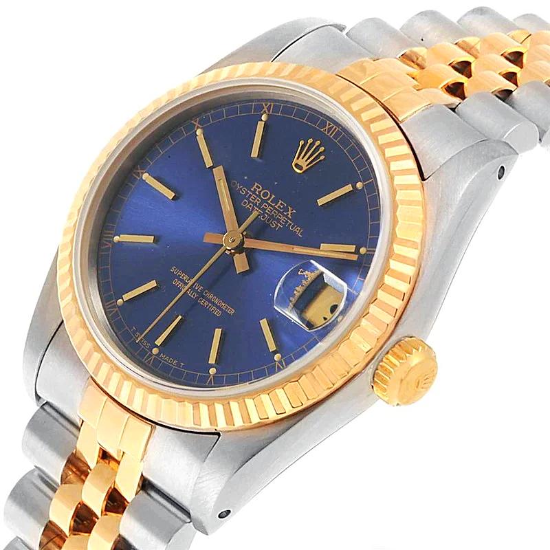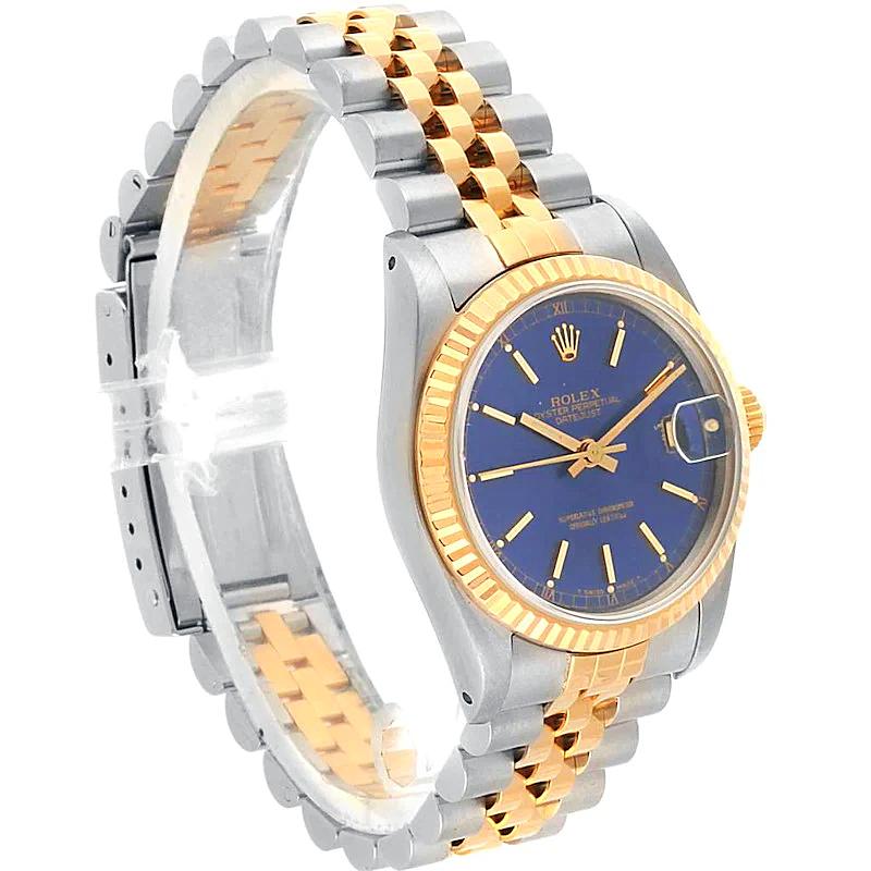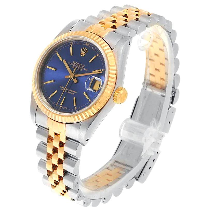 Ladies Rolex Midsize 31mm DateJust Two Tone 18K Yellow Gold / Stainless Steel Watch with Blue Dial and Fluted Bezel.