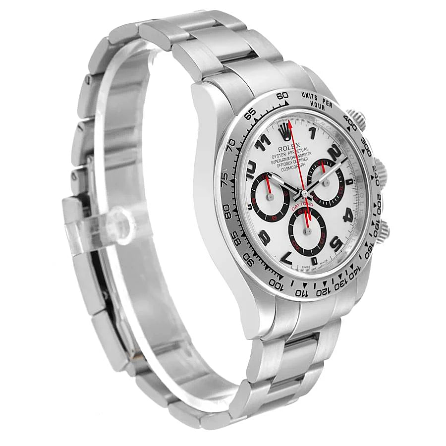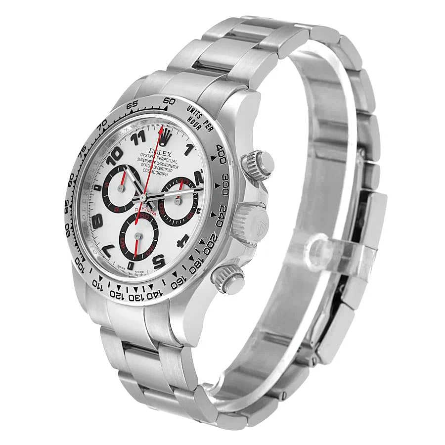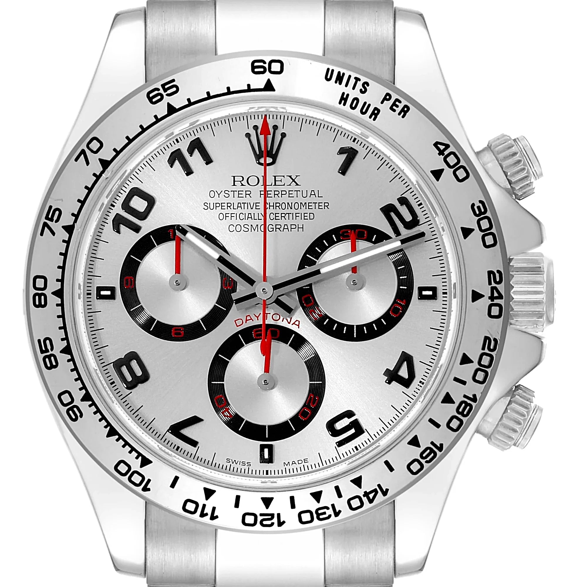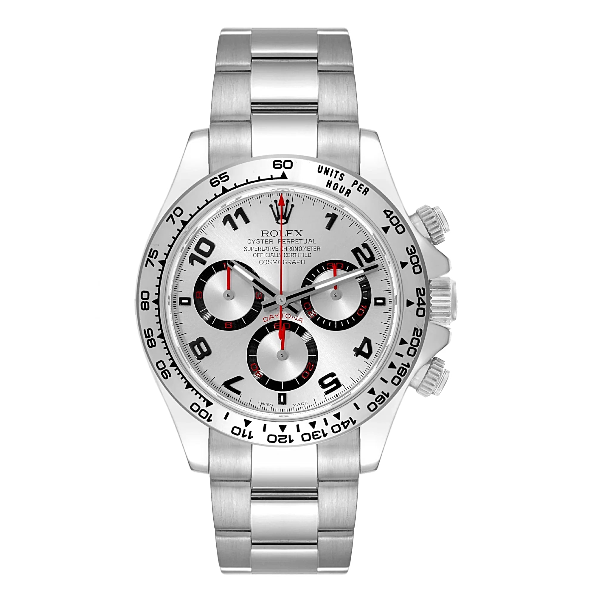 Additional Details: Brand: Rolex. Model Name: Rolex Daytona White Gold Silver Racing Dial Men's Watch 116509 with Box and Paper. Model Number: 116509. Year of Manufacture: 2008. Gender: Men's. Movement: Officially certified chronometer featuring a self-winding mechanism. Comprises 44 jewels, a straight line lever escapement, a monometallic balance adjusted for temperature variations and five positions, a shock absorber, a self-compensating free-sprung Breguet balance spring, Microstella regulating screws, and a hack mechanism. Jewels: 44. Caliber: 4130. Case: 40 mm diameter 18K white gold case. Features a screwed-down case back, buttons, and crown, along with a Triplock winding crown safeguarded by a crown guard. Bezel: 18K white gold tachymetric engraved bezel. Crystal: Scratch-resistant sapphire crystal. Dial: Silver dial adorned with luminous white gold hands and Arabic numeral hour markers, with minute markers encircling the outer rim. Includes three chronograph subdials for 60 seconds, 30 minutes, and 1/10th of a second. Bracelet: 18K white gold oyster bracelet equipped with a flip-lock clasp, accommodating a wrist size of 7.50 inches. Condition: Excellent. Working Condition: Accurately timed using the Witschi watch expert timing machine, operating robustly and maintaining precise time.